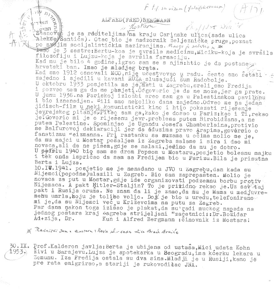 Alfred Bergman is the brother of Dr. Berta Bergman, and the uncle of fallen fighters Mihajlo Kon and Radojka Krčmar. His execution, along with the prisoners from Kerestinec, was depicted in the third episode of the TV series “Unconquered City” (source: Antifašistički vjesnik).