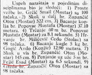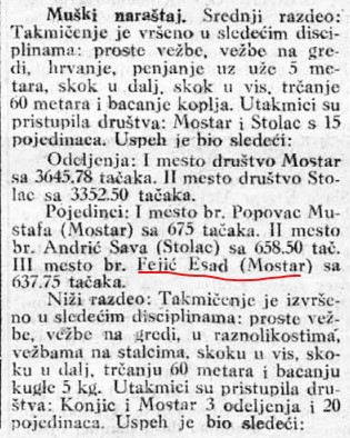 ESAD ESA FEJIĆ, son of MUHAMED, born on March 24, 1918, in Mostar. A worker, athlete in the organization “Soko”, soccer player at “Velež” football club, a local bicycle racer with “his own ice skates for ice competitions,” an activist of the National Liberation Movement (NOP) in Mostar. He was the only fugitive from a Ustaše truck in July 1941 when several hundred Serbs from the city were taken to execution sites. In the same month, he joined the first group of fighters from Mostar to Eastern Herzegovina to organize an uprising. He was wounded and captured by the Ustaše but was freed during an action carried out by Mostar’s underground members (Mladen Balorda and Ahmed Pintul). The wounded Esad (“muscles of his arm were torn, blood vessels ruptured, bones protruded”) was then operated on by Dr. Zvonko Marić and medical student Alija Krpo, and after the surgery, he initially hid in Ajnija Arap’s apartment but was later transferred to the hospital for treatment under a false name. Upon his return to Mostar, he worked in an underground group that collected weapons, medical supplies, and other necessities for partisan units. As an underground member, he and a group of partisans from the unit infiltrated an Italian camp in Mostar and seized large quantities of ammunition, taking them to Boračko Lake.