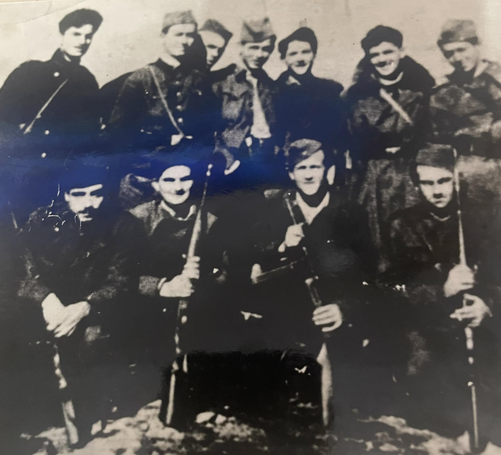 Grupa boraca i rukovodilaca Mostarskog bataljona. Sjede (s lijeva na desno): Talijan, partizan, Savo Savčić, NH Meha Trbonja, Talijan, partizan. Stoje: Alica Krpo, Fadil Numić, Husa Orman, NH Ahmed Pintul, NH Enes Orman, neidentifikovani.