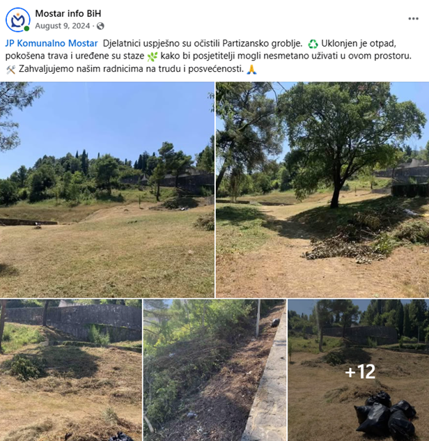 Povremena kratka obavijest od JP Komunalno Mostar ukazuje na određenu brigu o Partizanskom spomeniku. Izvor: Facebook. Robert Kepić: “Uposlenici koji povremeno pokose travu i trimerom uklone dendrofloru uz arhitektonsku cjelinu jedini su čuvari te pejzažne cjeline (…) tim ljudima duguje se zahvalnost (…)”